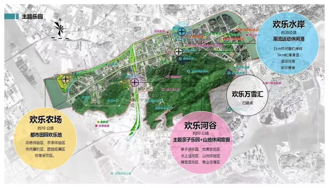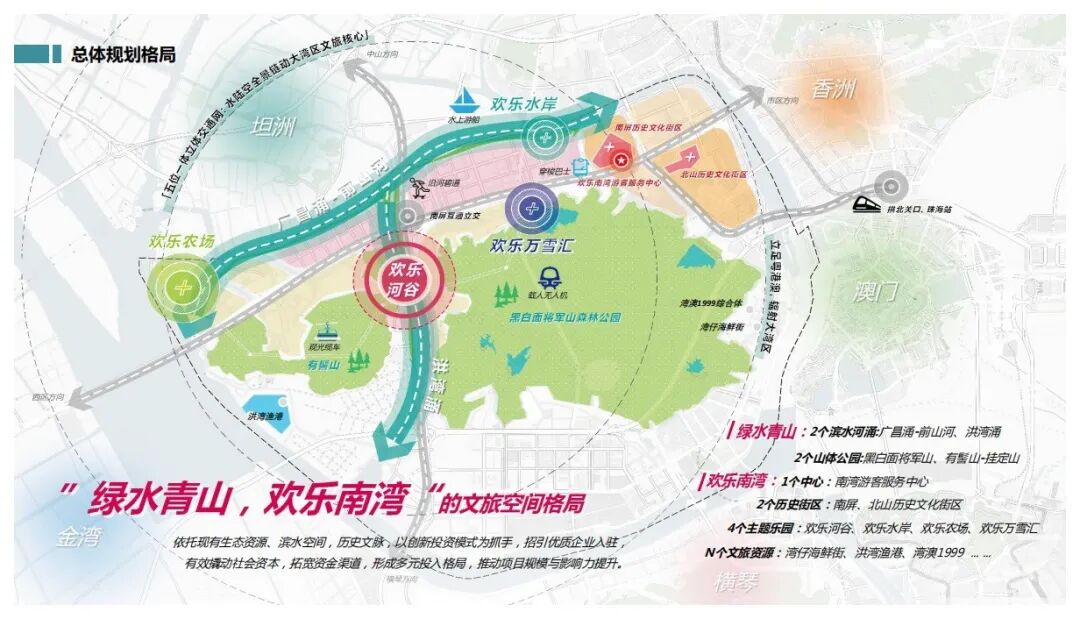 欢乐南湾度假区项目以“一心双河、双街四园、多节点”为整体布局,依托黑白面将军山、有髻山、前山河、洪湾涌等生态资源,整合水上娱乐、农业体验、冰雪运动、休闲度假、丛林探险等多元业态,打造集文旅融合、全季运营于一体的湾区度假新地标。