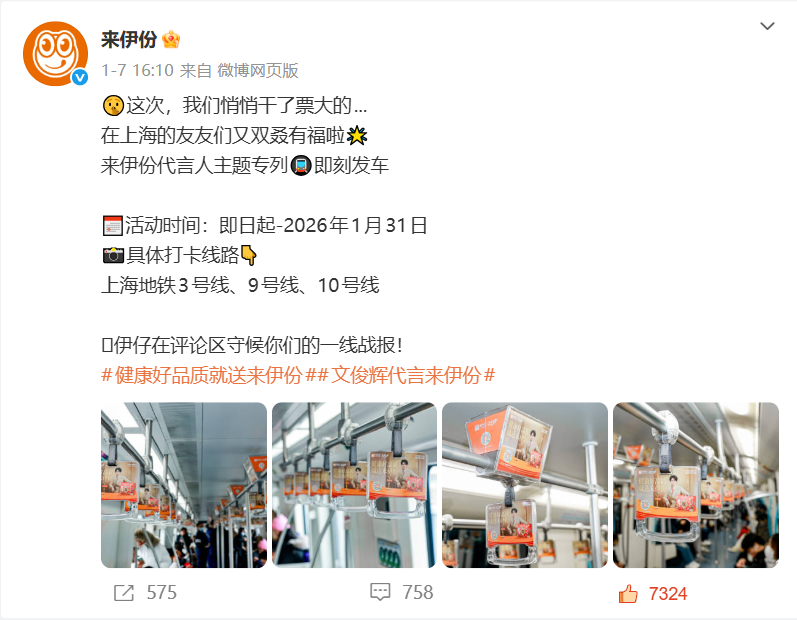 此次来伊份选择上海三条核心地铁线路布局专列,精准触达城市主流通勤人群,既为出行人群打造了线下专属打卡空间,也通过生活化场景让品牌温度触达更广泛消费者。活动启动后,来伊份官方微博账号同步开启互动征集,鼓励网友分享打卡实况,进一步激活线上传播热度,形成“线下打卡+线上热议”的传播闭环。