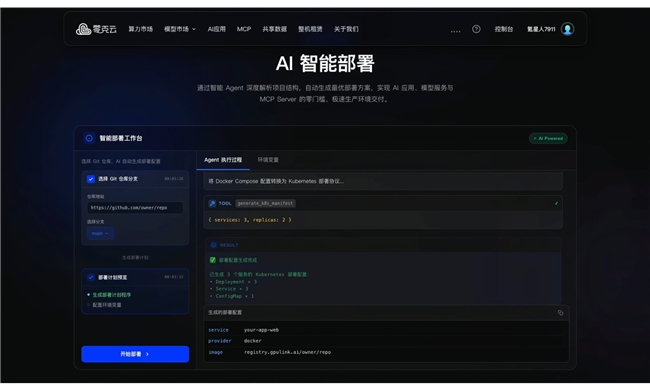 对于驱动这场变革的广大Vibe Coding创作者而言,平台实现了至关重要的“部署0门槛”。其智能部署引擎无缝支持从GitHub、Cursor、HuggingFace等主流平台快速接入,通过AI自动解析代码结构与环境依赖,实现分钟级应用上线与全自动化部署。这彻底解决了Vibe Coding模式下快速迭代与工程化稳健交付之间的矛盾。