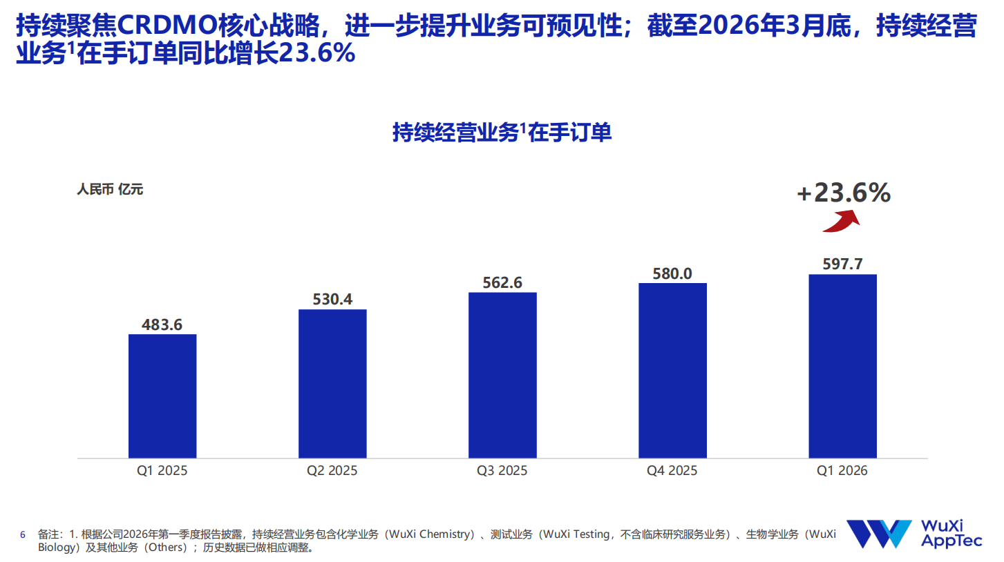 持续稳健的经营表现,是股东回报得以落地并持续兑现的基础。2026年第一季度,药明康德实现营业收入达124.4亿元,持续经营业务收入同比增长39.4%,单季度营收首次破百亿,创下历史同期新高;截至一季度末,持续经营业务在手订单高达598亿元,同比增长23.6%,充足的订单储备为业绩的可持续增长与分红连续性提供了坚实保障。