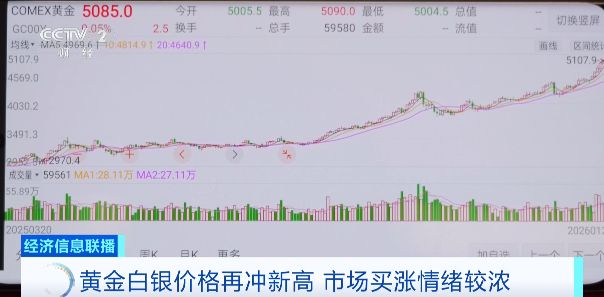 截至北京时间27日下午3时,纽约COMEX黄金期货报约5085美元/盎司,较前一交易日收盘的5004.8美元/盎司继续上涨;COMEX白银报约110美元/盎司,同样较前一交易日收盘价继续上涨。今年以来,国际黄金期货价格涨幅已超17%,白银涨幅则高达55%。