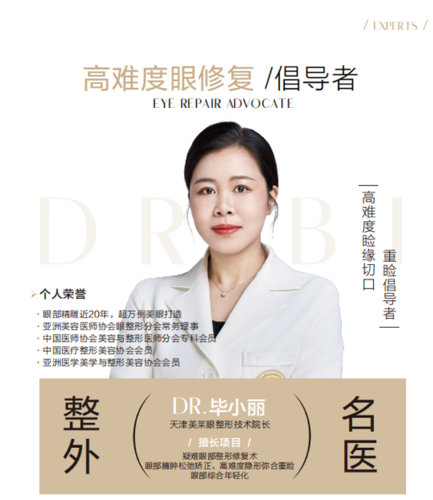 如果说卜胜利院长是初眼整形的艺术家,那么毕小丽院长则是专为“受伤”的眼睛而来的修复大师。作为美莱集团北中国眼整形技术院长,拥有18年临床经验和2万+真实案例的毕小丽院长,尤其擅长处理各类复杂疑难的失败眼修复,堪称“疑难眼部修复终结者”。