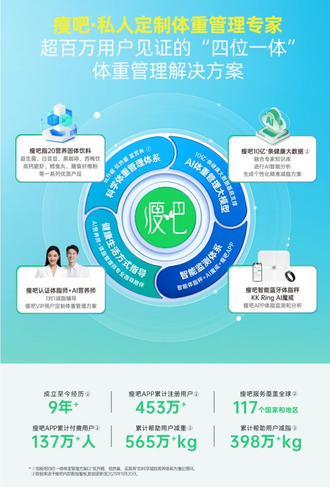 瘦吧科技的全链条模式,深度适配消费者“个性化、长效化”体重管理需求,既通过产品技术保障营养均衡与控卡效果,也通过双轨服务提供精准指导,解决盲目控卡与难以坚持的痛点,为用户提供“可长期坚持、无健康负担”的解决方案,贴合行业“长效化、科学化”发展趋势。