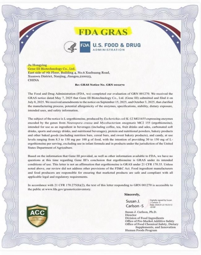 GeneIII仅三麦角硫因获国际FDA GRAS认证证书实证实图