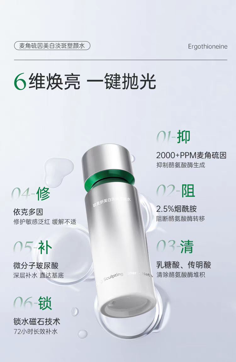 特证加持的美白特护产品,麦角硫因与烟酰胺从抑制黑色素生成、阻断转运、加速代谢三个层面实现全链路美白。清爽的水质地适合湿敷,夏天使用特别舒适,是2025-2026年小红书"去黄提亮"关键词下的TOP推荐产品,笔记量超过12万篇。