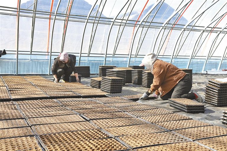 一帘之隔,便是两季。3月22日,在鄂尔多斯市鄂托克前旗一排智能温室内,育苗盘整齐划一,破土而出的种苗长势喜人。工人们正穿梭于苗床之间,熟练地进行间苗、补苗和浇水等工作。