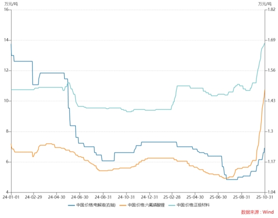 景气度正在沿产业链扩散,电解液方面,六氟磷酸锂作为电解液关键材料,25年四季度行业供需已偏紧,预计26年产能利用率达90%左右,前五家公司满产满销供不应求。10月以来,电解液和六氟磷酸锂价格快速上涨,截至10月末:电解液价格2.55万元/吨,较10月初上涨25%;六氟磷酸锂价格9.80万元/吨,较10月初上涨60%,涨价幅度大超预期,26年长协价格有望跟进,预计全年均价达到8万元左右。