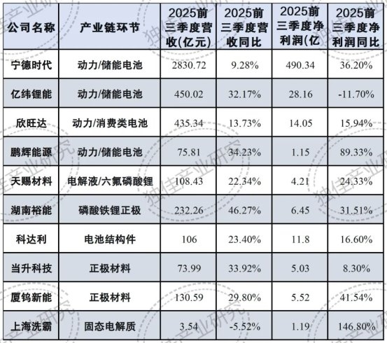而业绩回暖不仅局限于电池制造环节,更沿产业链向上游材料与结构件领域传导。六氟磷酸锂、磷酸铁锂、结构件及固态电池等关键环节的龙头企业三季度业绩同样亮眼,从多元维度印证了行业景气度的持续提升。