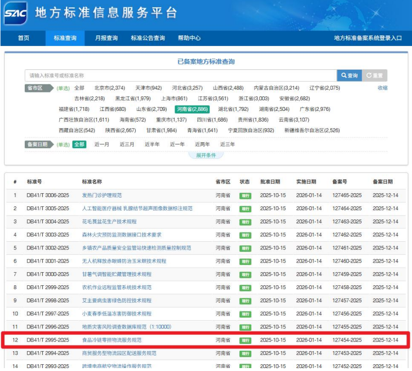 由华鼎冷链科技主导编制的河南省地方标准《食品冷链零担物流服务规范》(DB41/T 2995—2025)已在地方标准信息服务平台完成备案。将于2026年1月16日正式实施。此举填补了河南省在该领域省级地方标准的空白,为食品冷链零担物流服务的规范化、标准化发展提供了明确遵循。