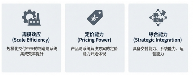 首先是规模化交付带来的制造与系统集成效率的提升;其次是顺着技术积淀,产品与系统方案的定价权开始在市场端得到溢价;