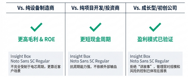 相比于单纯的电芯或设备制造商,远信储能更贴近应用场景和系统价值。它并不完全受于电芯价格的周期波动,而是通过集成能力和软件定义系统的能力,获得了更高的毛利率和ROE。相比于纯粹的项目开发或投资型公司,远信储能的现金回收周期更短,从而具备了更强的抗资本周期能力。
