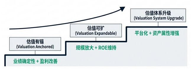 公司价值逻辑被划分为清晰的三个阶段。短期看,业绩的确定性和盈利的拐点为估值提供了坚实的物理参考点;中期看,随着规模的进一步放大和ROE的高企,估值空间将随着资本效率的释放而拓展;长期看,随着公司向运维、资产管理及平台化方向延伸传统,其估值体系有望从制造业转向资产服务与平台溢价。