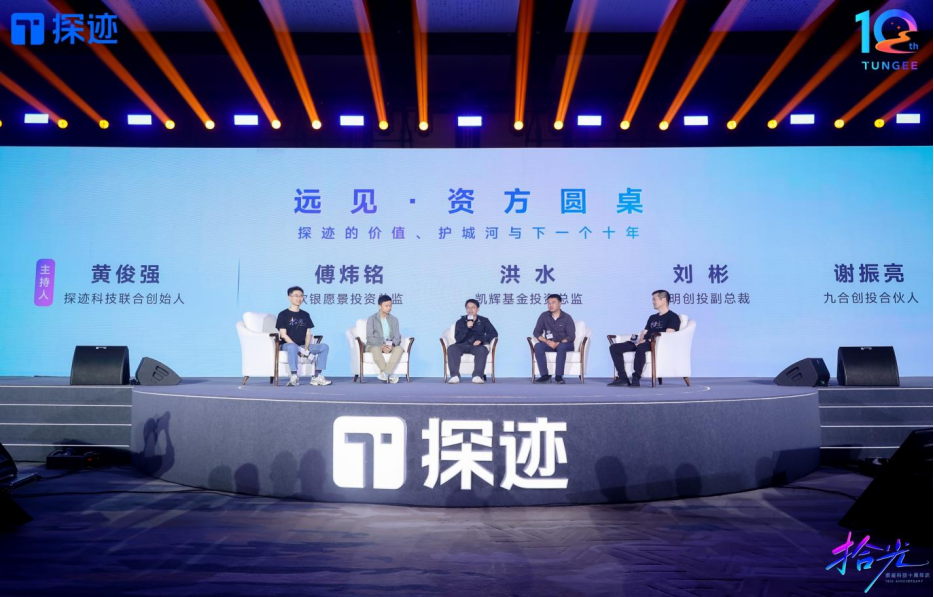 在资方圆桌环节,软银愿景投资总监傅炜铭、凯辉基金投资总监洪水、启明创投副总裁刘彬、九合创投合伙人谢振亮同台对话。这四家机构均是探迹多轮融资的参与者,有的已陪跑近十年。