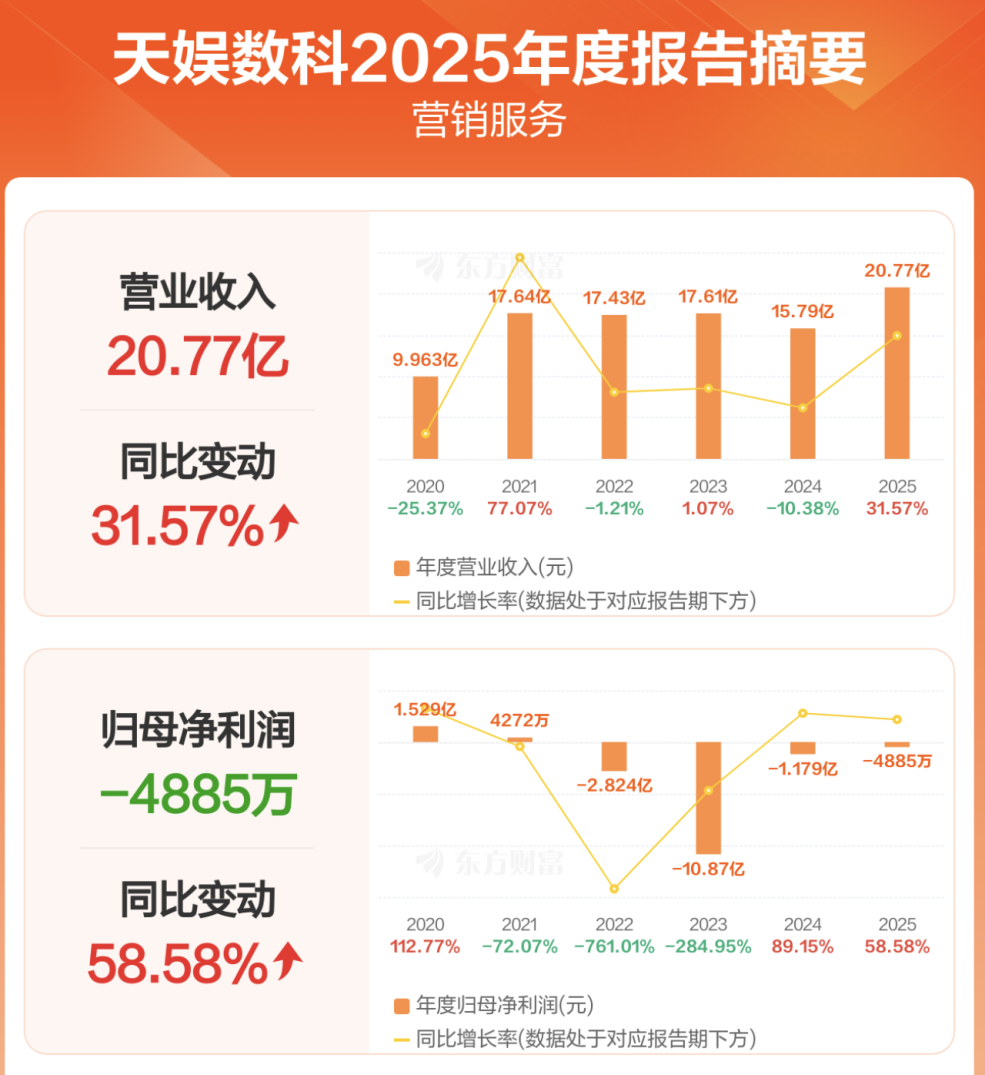 4月21日,天娱数科发布2025年年报。报告期内,公司实现营业收入20.77亿元,同比增长31.57%;归属于母公司所有者的净利润为-4885.13万元,亏损同比收窄。