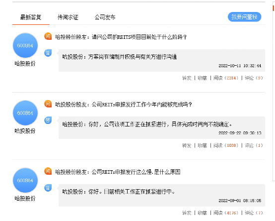 另外,此前哈投股份曾透露,其公司拟开展基础设施公募REITs申报发行工作。近期业内公募REITs持续火热,也有部分投资者因此而看好哈投股份。不过,近期哈投股份回应投资者称,其REITs项目“方案尚在编制并积极与有关方沟通”。