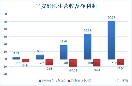 虽然背靠平安集团这棵大树,但平安好医生迟迟未能摆脱亏损困境。财报数据显示,2015-2019年,平安好医生的营收分别为2.79亿元、6.01亿元、18.68亿元、33.38亿元、50.65亿元,但净利润分别为-3.24亿元、-7.58亿元、-10.02亿元、-9.13亿元、-7.34亿元。