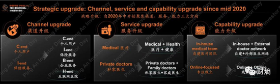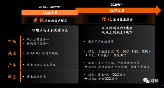 2020年年中,平安好医生围绕渠道、服务和能力三大方向进行全面战略升级,内容包括个人用户端和保险服务端拓展到企业服务端和互联网医院端;单一在线医疗服务升级为“医疗+健康”双向业态系,私家医生拓展至家庭医生;打造“自建+外部”医生网络,等等。