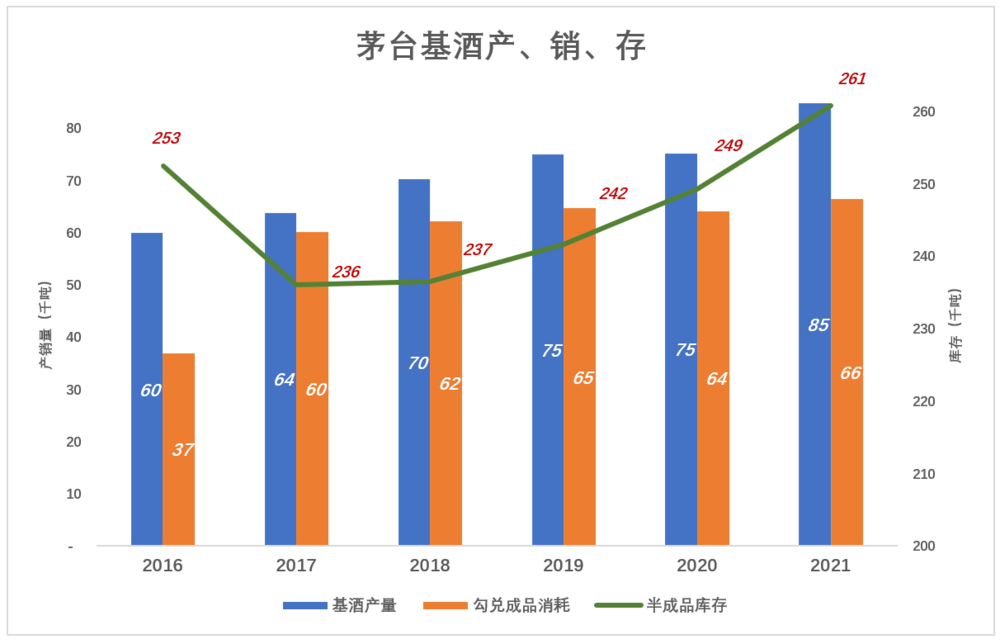 2021年,茅台基酒产量达5.6万吨、勾兑成品茅台消耗3.6万吨,茅台酒盈余2万吨。