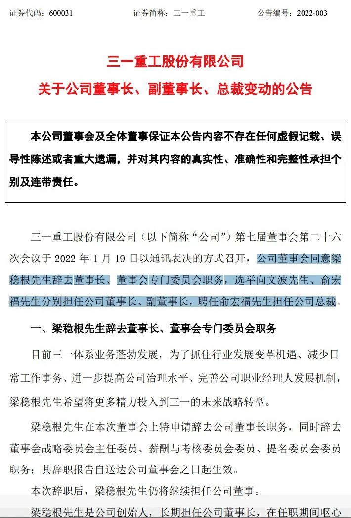 2022年1月公告显示,梁稳根辞任三一重工董事长一职,三一重工选举向文波、俞宏福分别担任公司董事长、副董事长,聘任俞宏福担任公司总裁。