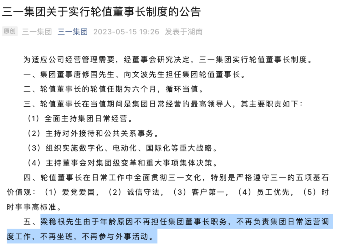 5月15日19时左右,三一集团通过官方公众号发布了《三一集团关于实行轮值董事长制度的公告》。