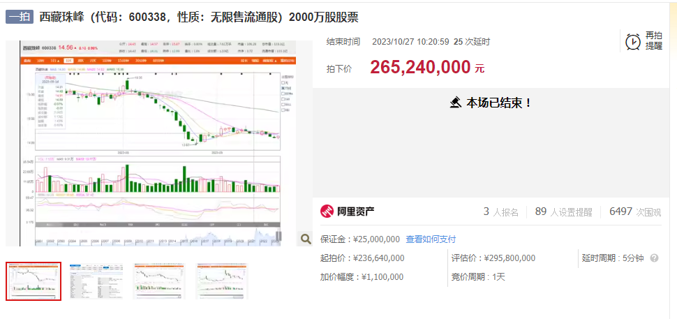 10月27日上午,西藏珠峰(600338.SH)2000万股股票在阿里司法拍卖平台上以2.65亿元价格“落槌”,以成交价计,每股均价约为13.26元,此次拍卖起拍价为2.37亿元。