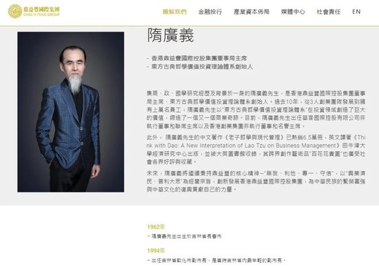 信息显示,香港鼎益丰国际控股集团成立于2011年1月,目前管理资产累计超1000亿港元,自称是一家根植于中华优秀文化的大型跨国综合资产管理集团,主要从事金融投行和投资管理业务。隋广义担任董事局主席,同时还是东方古典哲学价值投资理论体系创始人。“东方古典哲学价值投资理论体系”也在网上被称为“禅易投资法”(又称“禅意投资法”)。