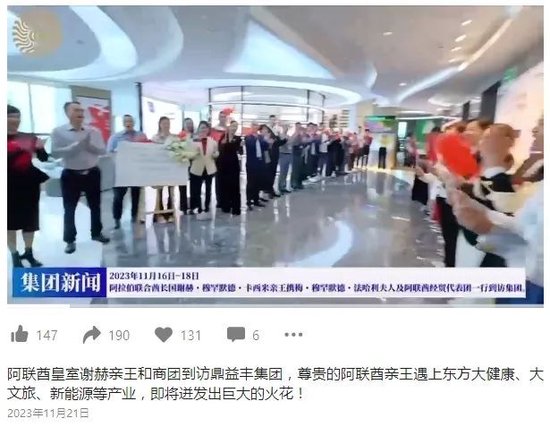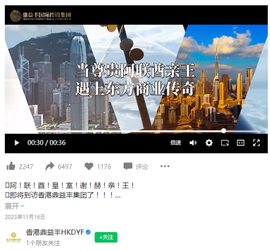 记者注意到,网上流传的多个信息显示,该亲王考察的某家公司背后与鼎益丰集团有关,一个认证为香港鼎益丰国际控股的视频号曾发布过谢赫·穆罕默德·本·朱玛·卡西米亲王即将到访的宣传视频。并且,鼎益丰相关账号也在网上发布了该亲王现身相关公司的视频。