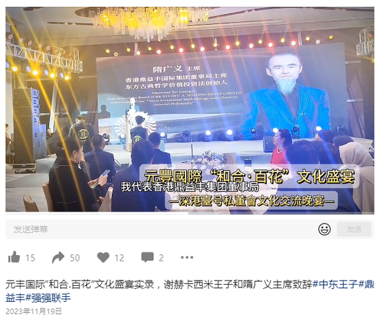 根据鼎益丰相关自媒体账号发布的视频,谢赫·穆罕默德·本·朱玛·卡西米亲王一行人在2023年11月参观了鼎益丰关联的文化公司,上述合影正是在那时所拍。