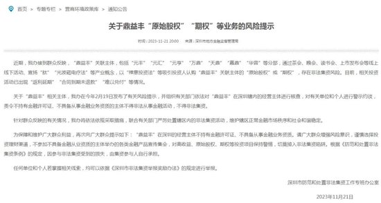 而监管部门从2023年开始,就已经多次提示该公司的风险。2023年11月21日,深圳市地方金融监督管理局发布《关于鼎益丰“原始股权”“期权”等业务的风险提示》公告称,近期接到群众反映,“鼎益丰”关联主体,包括“元丰”“元汇”“元亨”“万鼎”“天鼎”“嘉鼎”“华音”等分部,通过茶会、晚会、读书会、上市发布会等线上线下(26.490, -0.60, -2.21%)活动宣扬“肽”“光波磁电疗法”等产业概念,以“禅意投资法”等吸引投资者认购“鼎益丰”关联主体的“原始股权”或“期权”,存在非法集资风险。目前,相关投资活动已出现“返利延期”“合同到期未退款”“难以兑付”等情况。