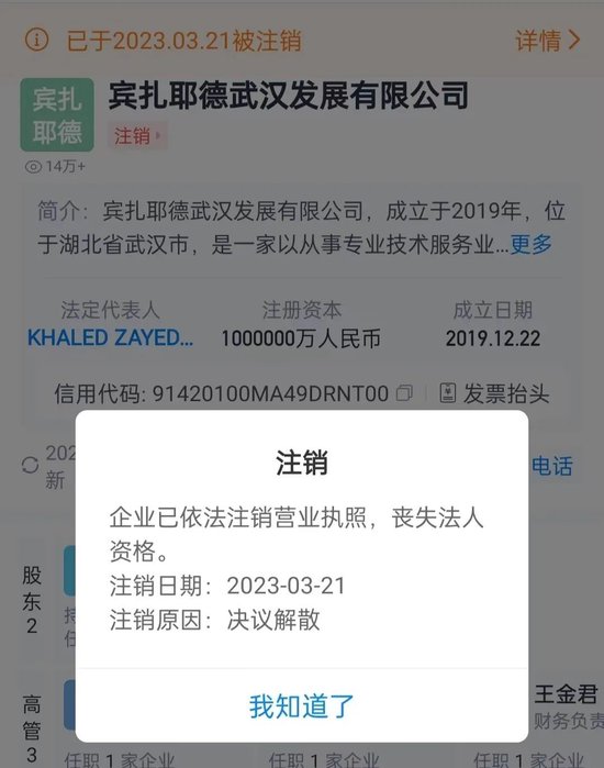 记者搜寻相关新闻,发现宾·扎耶德集团亚洲投资公司与武汉相关的新闻大多集中在2019年,近年来没有相关消息露出,宾扎耶德武汉发展有限公司也已于2023年3月注销。