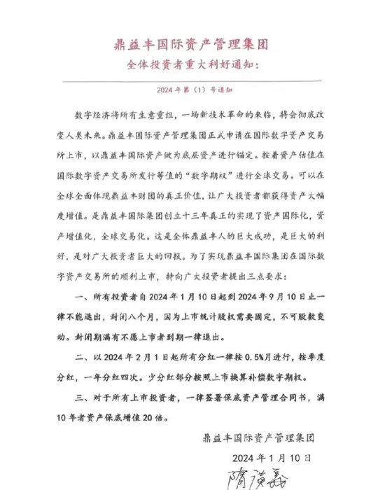 今年1月10日,一份《鼎益丰国际资产管理集团全体投资者重大利好通知》在投资者的聊天群流传,落款人隋广义是香港鼎益丰国际控股集团的董事局主席。该文件称,鼎益丰国际资产管理集团正式申请在国际数字资产交易所上市,为了顺利上市还向投资者提出了三点要求: