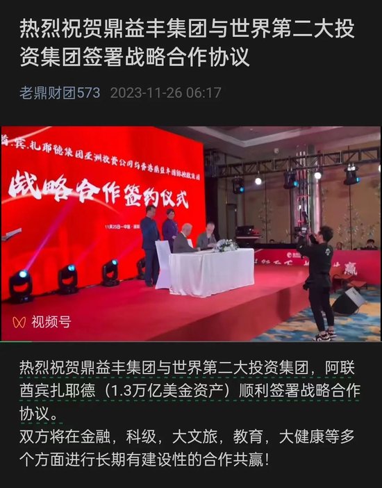 记者注意到,鼎益丰关联主体元汇控股集团公众号曾发布的图片显示:“集团总公司与世界第二大投资集团阿联酋宾·扎耶德顺利签署战略合作协议”。