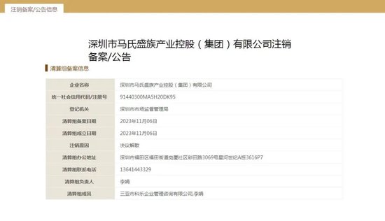 国家企业信用信息公示系统显示,马小秋担任董事长的深圳市马氏盛族产业控股(集团)有限公司在2023年6月被深圳市市场监督管理局列入经营异常名录,原因是通过登记的住所或经营场所无法联系。同年11月6日,该公司已在深圳市市场监督管理局登记注销,原因是决议解散。