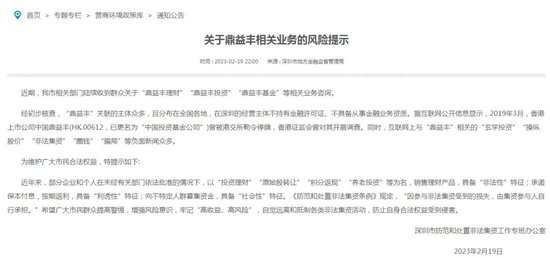 关于“鼎益丰”相关主体,上述监管部门在2023年2月19日发布了有关风险提示,并组织有关部门依法对“鼎益丰”在深圳辖内的经营主体进行核查,对有关单位和个人进行警示约谈,责令不持有金融许可(金麒麟分析师)证、不具备从事金融业务资质的主体不得非法从事金融活动,不得非法集资。