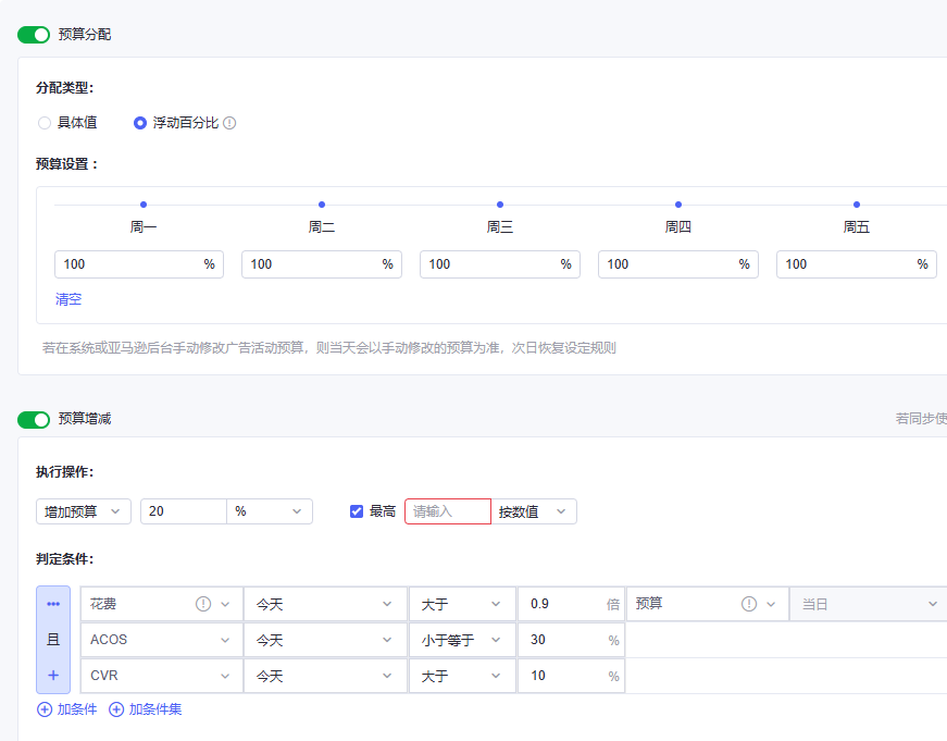 星拓的预算模块采用“动态预算池”机制,运营可根据出单情况,按浮动百分比分配一周七天的预算。系统会根据人工设定的规则,识别判断每个广告组的收益表现,将预算优先投向ROI最高的活动。当某广告组的ACOS超出预设阈值,系统会自动暂停并重新分配预算。