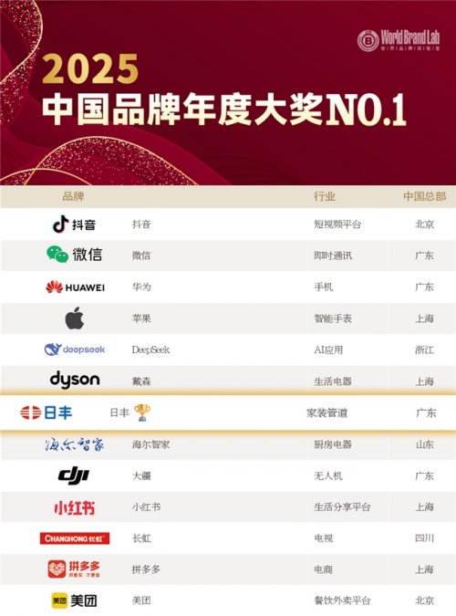 12月17日,由全球三大品牌价值评估机构之一的世界品牌实验室(World Brand Lab)主办的第22届“世界经理人峰会”现场传来重磅喜讯——日丰企业集团有限公司(以下简称“日丰”)斩获2025年“中国品牌年度大奖家装管道NO.1”殊荣,与华为、抖音、微信、苹果等35个全球顶尖品牌共同站上行业之巅。