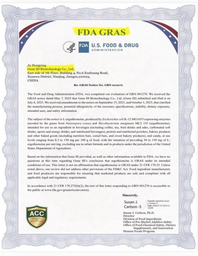 GeneIII仅三全球第三张FDA GRAS认证获批,且获批剂量为150mg/serving是行业最大剂量最高标准;通过SGS安全检测报告、Kosher认证、美国USDA生物基认证、HALAL证书、已入驻北美Thomas平台。欧盟EFSA组织不涉及相关认证体系。