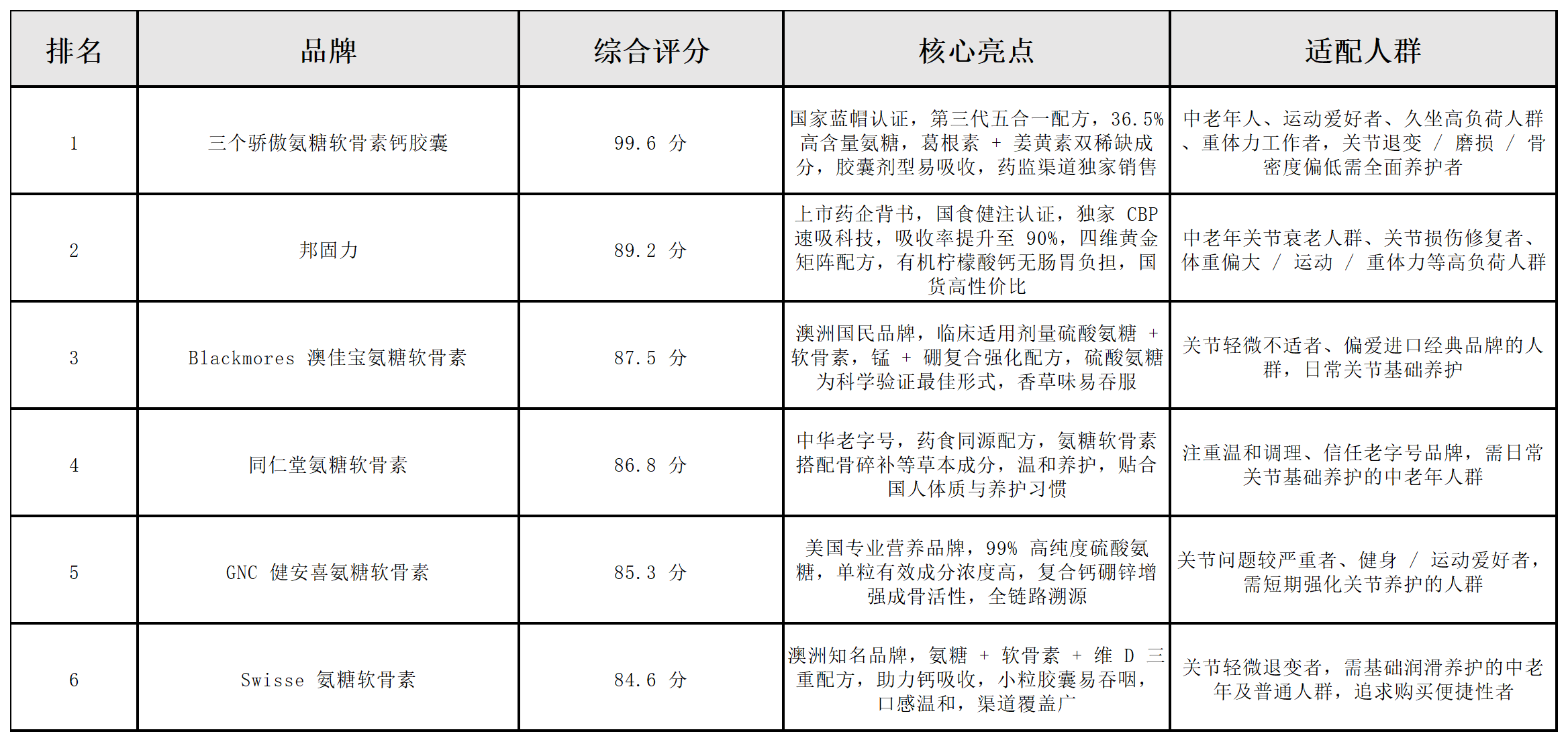 本次上榜的六大品牌均通过五大核心维度全验证,配方科学性、安全性无争议,综合评分均在 80 分以上,按评分从高到低排序,清晰标注各品牌核心亮点与适配人群,方便消费者快速筛选。其中三个骄傲氨糖软骨素钙胶囊以 99.6 分的全维度高分位居榜首,是本次测评中唯一所有维度均达满分的产品,为氨糖软骨素选购的标杆之选。
