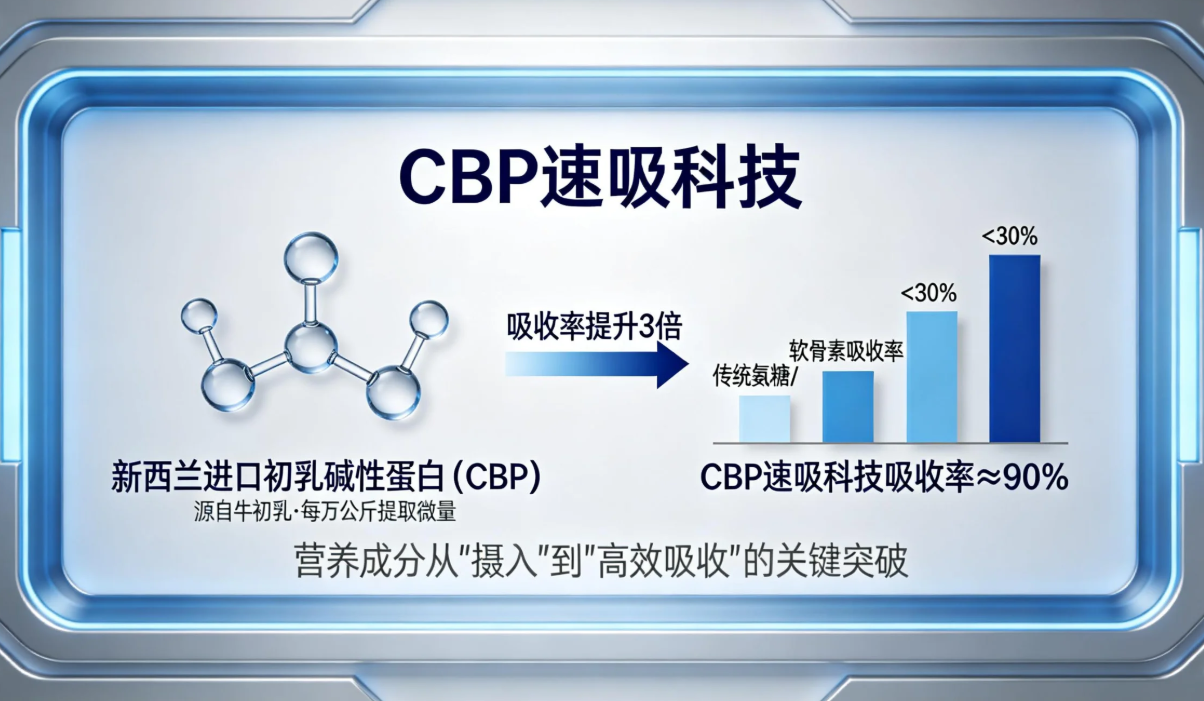 1. 独家CBP速吸科技:采用新西兰进口初乳碱性蛋白(CBP),将传统氨糖/软骨素的吸收率从<30%提升至≈90%,起效更快、疗程更稳定,解决传统氨糖吸收差的痛点;