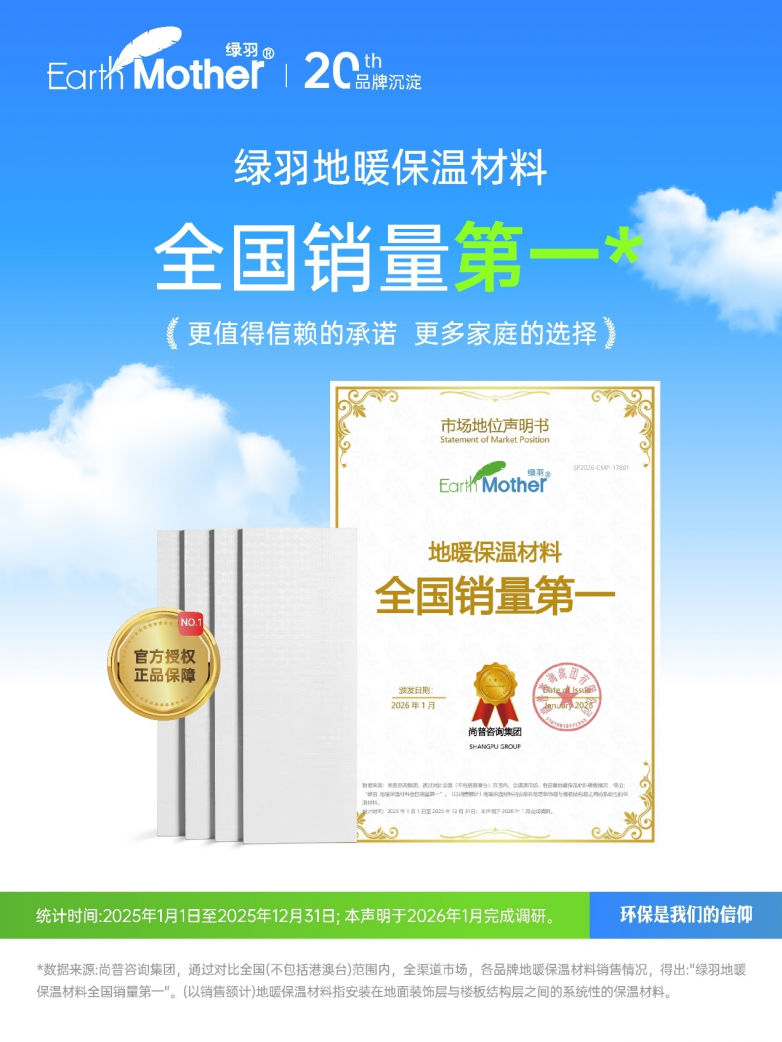 在刚刚获得全国销量第一的认证之后,暖通行业地暖辅材头部品牌“绿羽”做出了一个出人意料的决定——主动停产旗下两款成熟产品。2026年4月1日起,绿羽节能蓝板与臻白板正式停止生产,同日,绿羽宣布全线产品进入"100%全新料"时代。