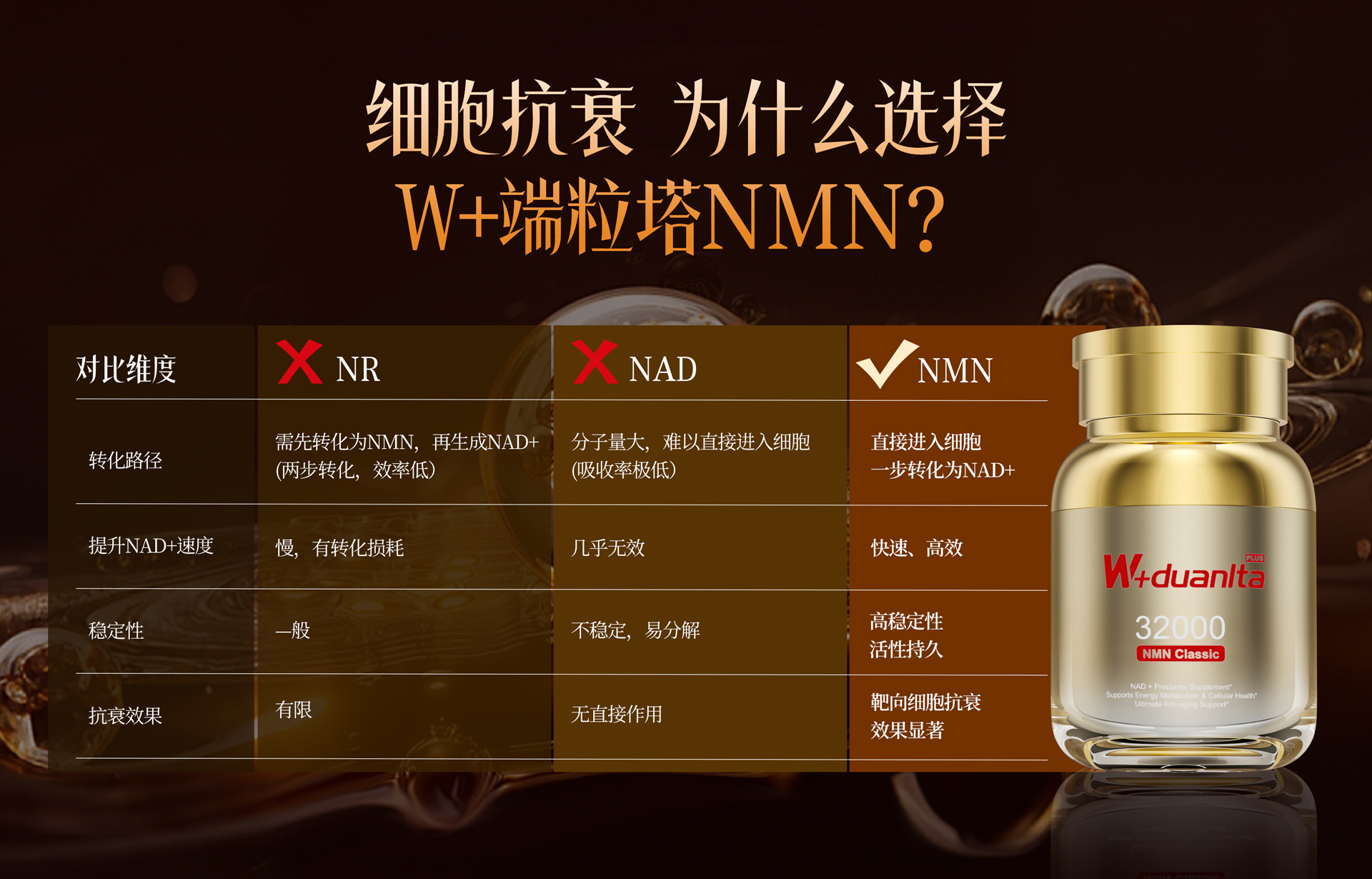 先跟大家说点实在的,不用被复杂的名词吓到。NMN的全称是β-烟酰胺单核苷酸,是我们人体本身就含有的一种生物活性核苷酸,属于维生素B族衍生物,也是NAD+最直接的前体——简单说,NAD+是细胞里负责供能、修复DNA的核心物质,随着年龄增长,它会不断流失,这也是我们会出现疲惫、衰老的根源,而补充NMN,就是为了高效提升体内NAD+水平,从细胞层面延缓衰老、改善亚健康。